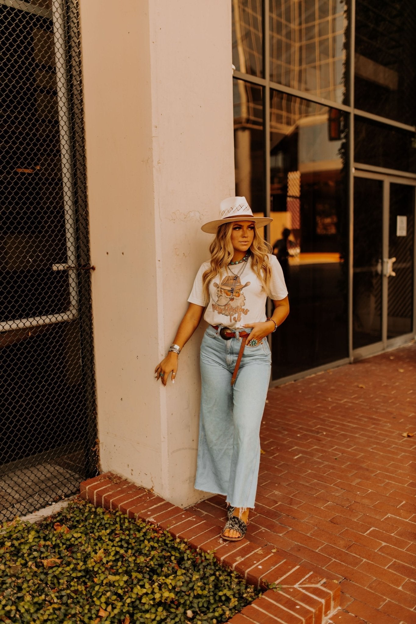Show off your love of cowboys and Christmas with our Cowboy Santa Christmas Graphic Tee! To top off your festive western look try pairing it with a pair of your favorite jeans, jewelry, and hat!