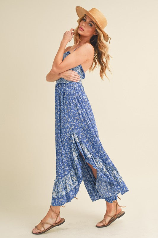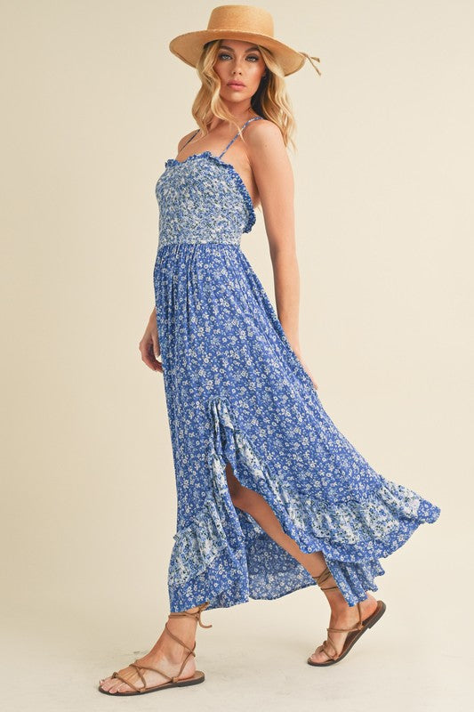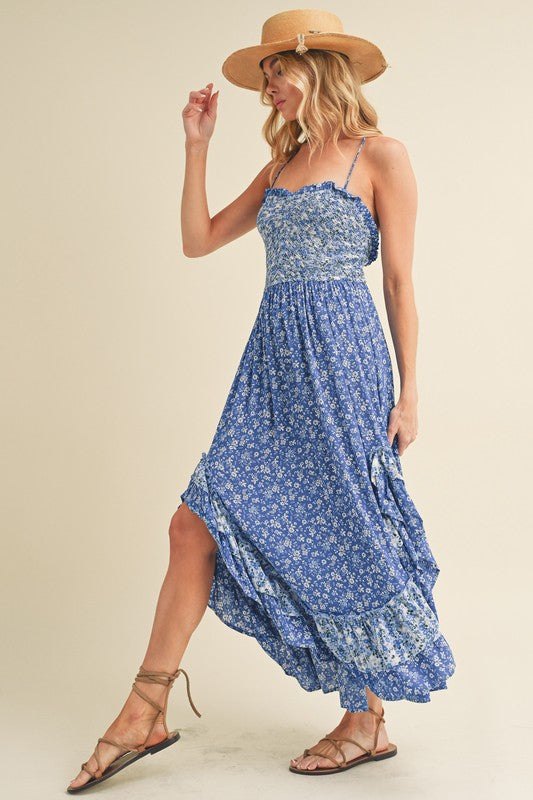 Elevate your style in this stunning maxi Deanne dress adorned with smocking and ruffles. The two-tone floral print adds a touch of romance, while the flowy silhouette exudes grace. Adjustable straps ensure a perfect fit, making it the epitome of effortless elegance for any occasion.