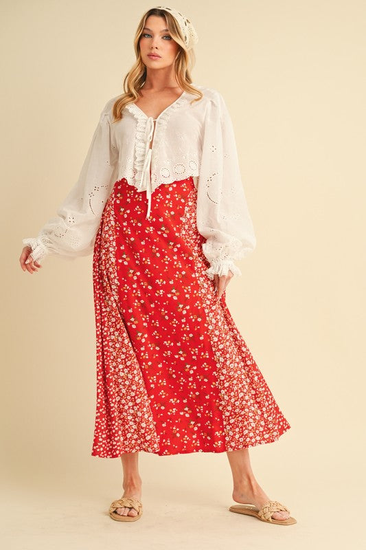 Melanie maxi skirt is crafted with a femme silhouette, contrasting floral patterns, and elasticated waistband for all-day comfort. Style with strappy sandals for your next garden party.